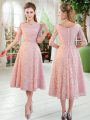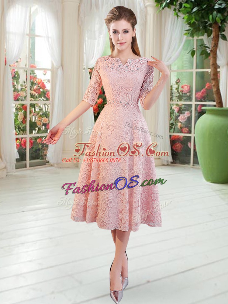 A-line Evening Dress Pink Off The Shoulder Lace Half Sleeves Tea Length Zipper