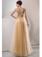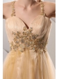 Home >  Prom Dresses >  Best Prom Dresses > A-line Gold Straps Appliques and Ruching Floor-length Organza Prom Dress