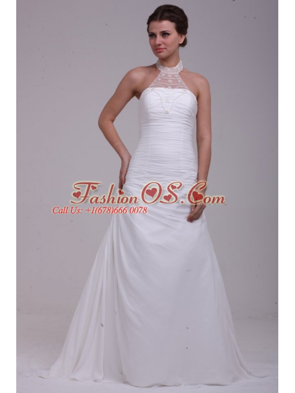 Home >  Wedding Dresses >  Perfect Wedding Dresses > A-Line Halter Ruching and Appliques Chiffon Wedding Dress