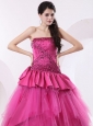 If you're determined to make a lasting forever impression on your party, try this gorgeous hot pink dress! The feminine profile starts from a strapless straight neckline trimmed by shimmering beadings. The flared, floor-length skirt falls from the drop waistline and decorated with tulle overlay. The lace up back completes the look and adds a final touch of elegance to an already stunning gown.
