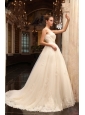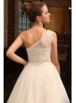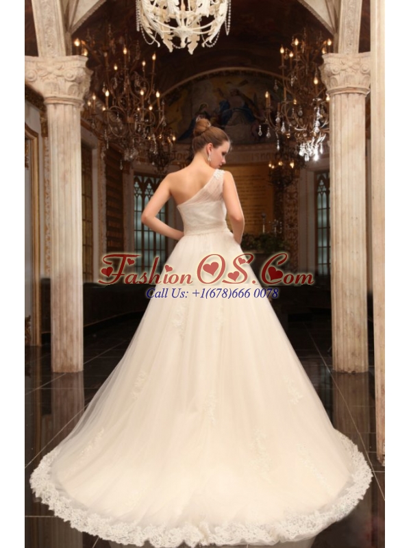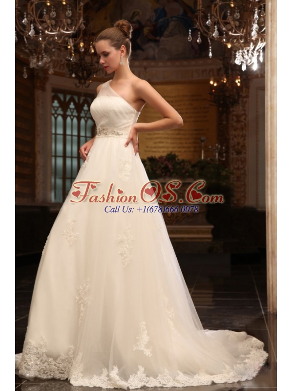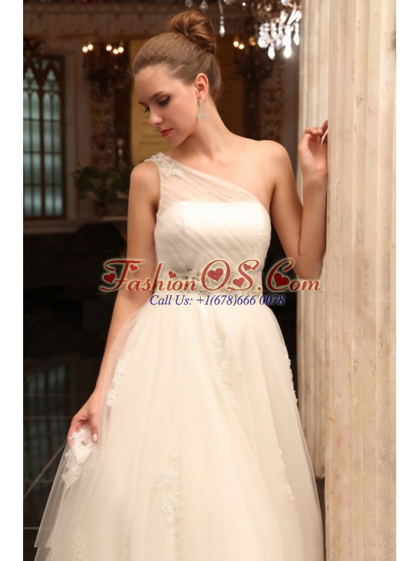 Home >  Wedding Dresses >  Perfect Wedding Dresses > A-Line One Shoulder Chapel Train Appliques Tulle Wedding Dress with Side Zipper