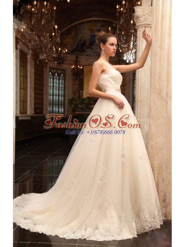 A-Line One Shoulder Chapel Train Appliques Tulle Wedding Dress with Side Zipper