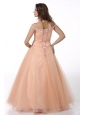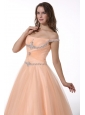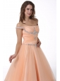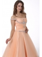 Home >  Prom Dresses >  Fashionable Prom Dresses > A-line Peach Off The Shoulder Beading Ruching Floor-length Tulle Prom Dress