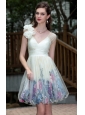 A-Line / Princess V-neck Knee-length Organza Hand Made Flowers Short Prom Dress