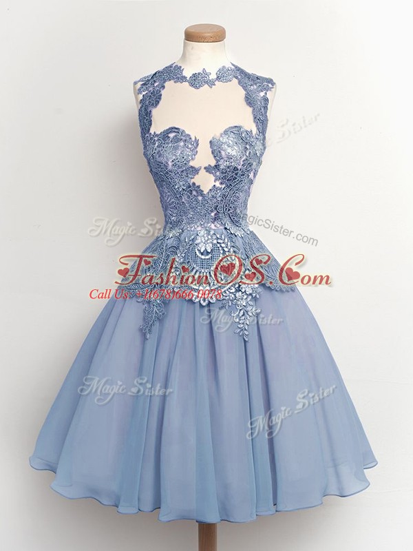 A-line Quinceanera Court of Honor Dress Light Blue High-neck Chiffon Sleeveless Knee Length Lace Up