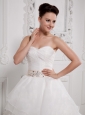 You will look like an angle in this gorgeous wedding dress! This wedding gown has a modest sweetheart on the ruched bust. The shining waistband is embellished with colorful beading. The Flirty layers of organza ruffles start form the dropped waist to create a luxury skirt for this eye-catching dress for your wedding ceremony. This dress will help you to make your dreams come true! Do not miss it!
