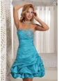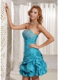 A-line Strapless Beaded Decorate Bust With Pick-ups Prom Dress Turquoise Blue Taffeta