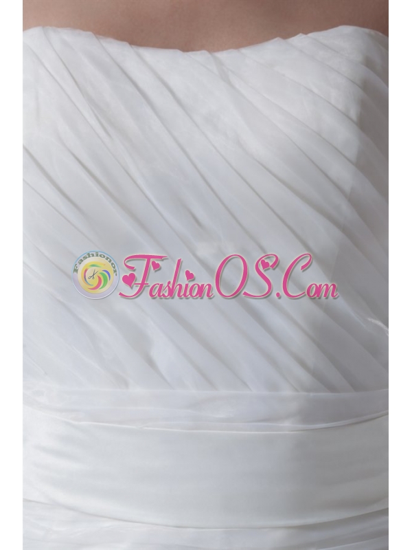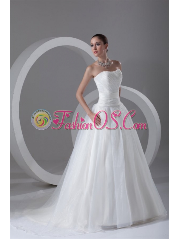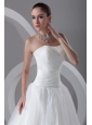 A-line Strapless Ruching Brush Train Organza Wedding Dress