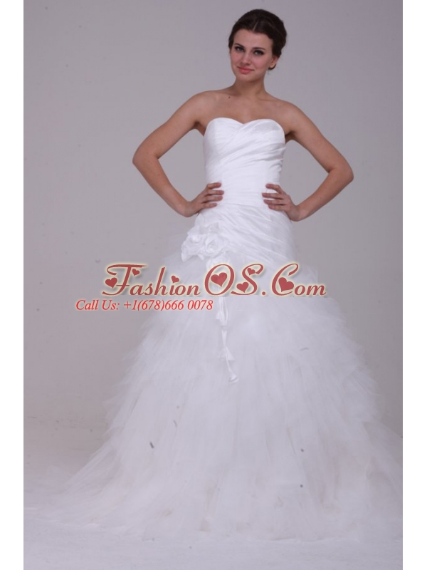 A-Line Strapless Ruching Tulle Wedding Dress with Brush Train
