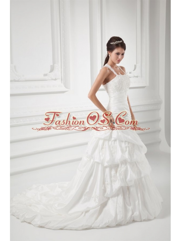 A-line Straps Appliques and Pick-ups Court Train Wedding Dress