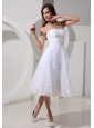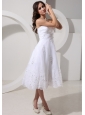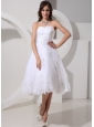 This special tea-length dress is so charming that never a style come close to it. It has a lovely strapless sweetheart bodice which is decorated with exquisite appliques and beadings. The lace overlaid the skirt which is also embellished with scattered appliques make you look more gorgeous. The fabric-covered buttons above the hidden zipper closure gives the back a completing looking.