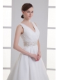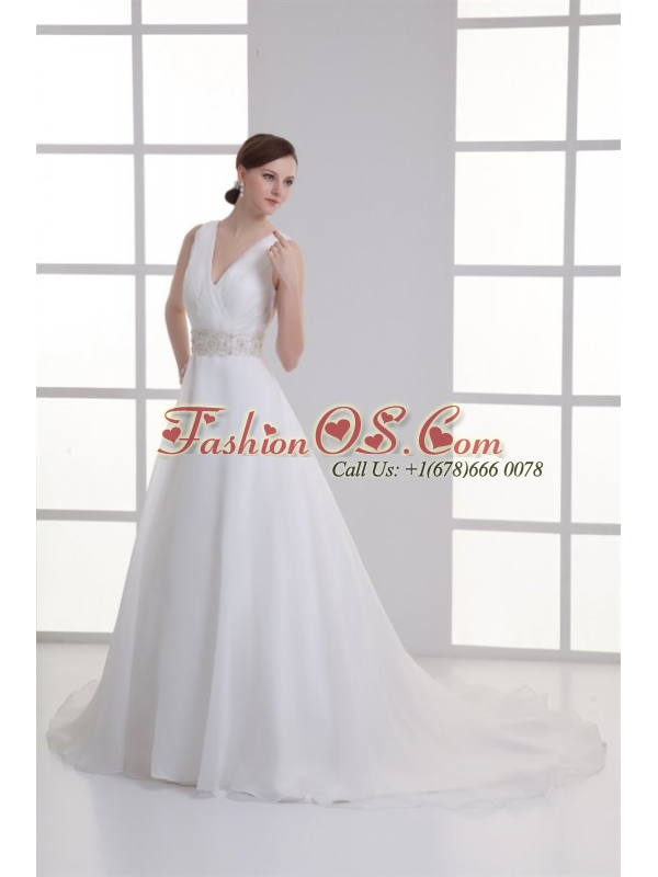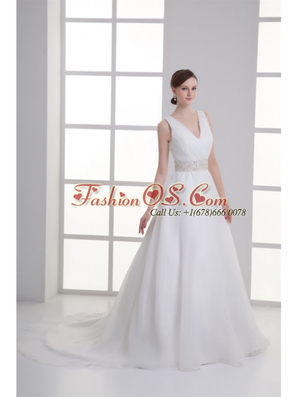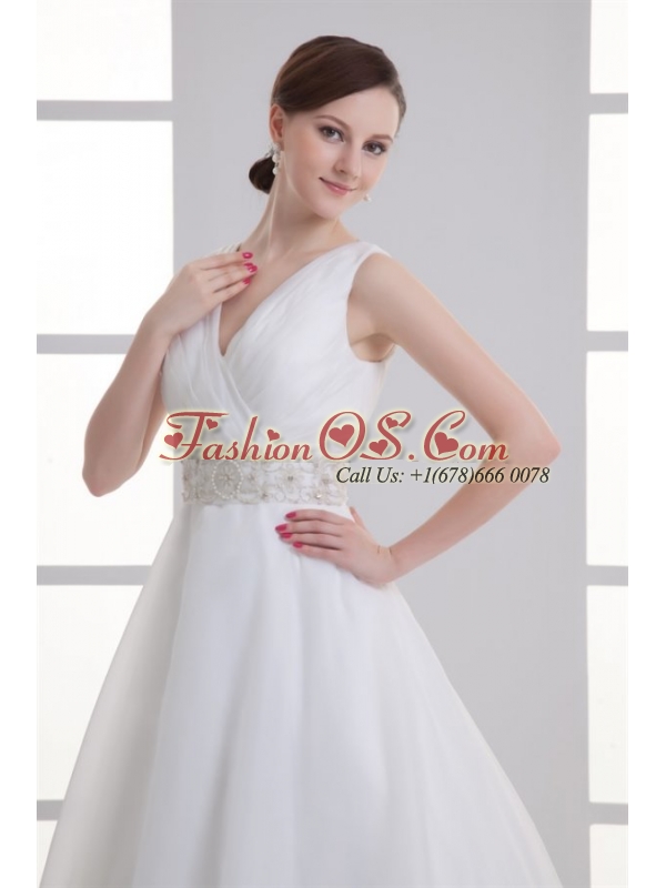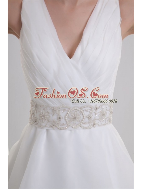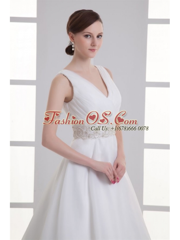A-line V-neck Ruching Organza Beading Belt Court Train Wedding Dress