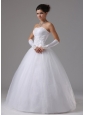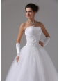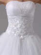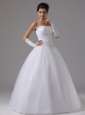 You'll be glowing in this glamorous bridal gown.This elegant bridal gown features a strapless bodice and is accented with lace floral patterns embellished with shimmering beads throughout the bodice. The full skirt is simple in tulle tiers to form a A-line figure. A lace up back compleates the look. A romantic dress for your big day.