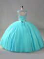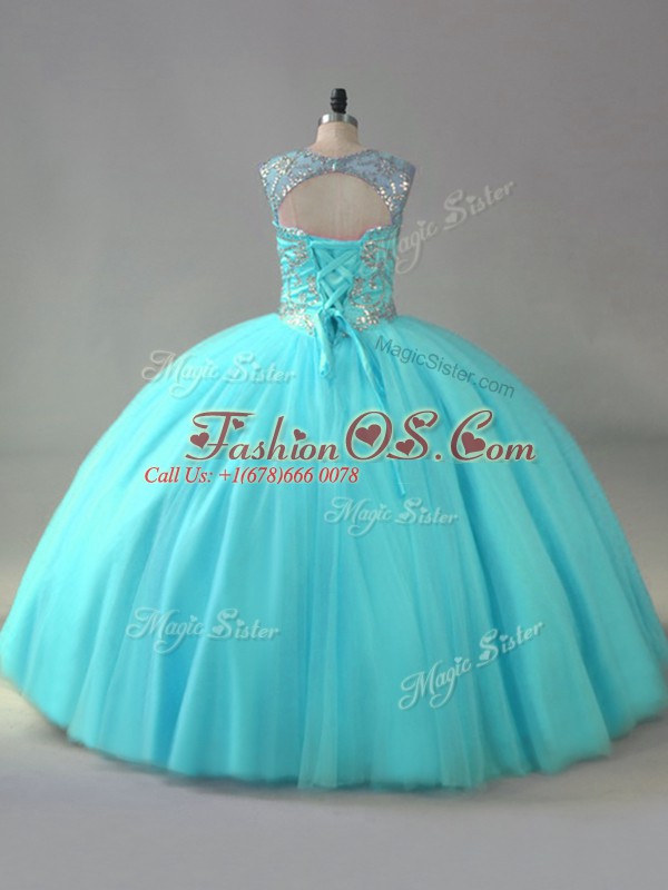 Amazing Aqua Blue Ball Gowns Scoop Sleeveless Organza Lace Up Beading 15th Birthday Dress