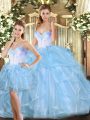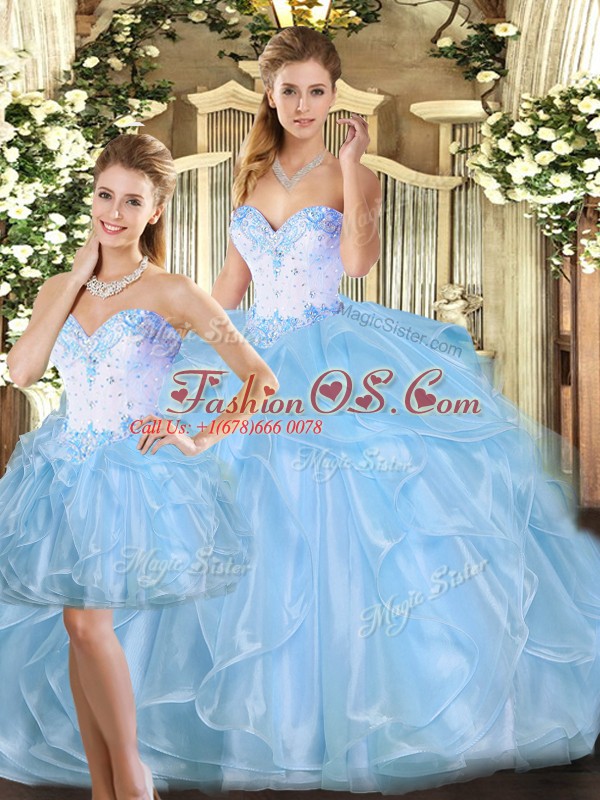 Amazing Blue Ball Gowns Halter Top Sleeveless Organza Floor Length Lace Up Beading and Ruffles 15 Quinceanera Dress