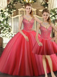 Amazing Coral Red Three Pieces Tulle Straps Sleeveless Beading Floor Length Lace Up Quinceanera Gown