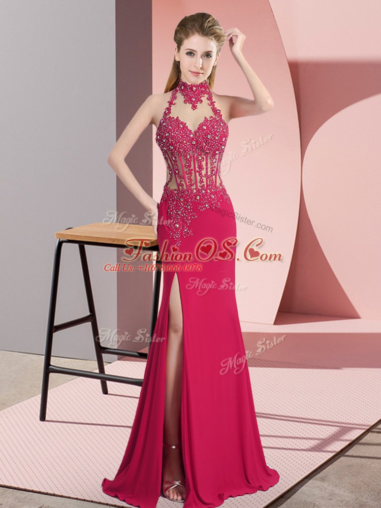 Amazing Hot Pink Halter Top Neckline Beading Prom Gown Sleeveless Backless