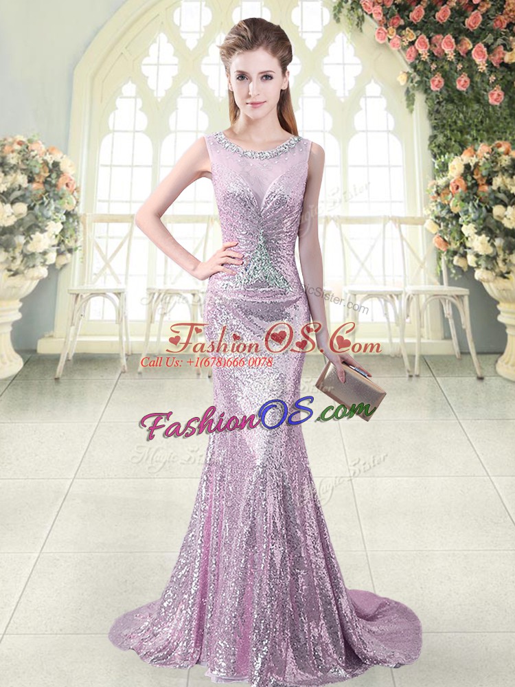 Amazing Lilac Sequined Zipper Scoop Sleeveless Homecoming Dress Brush Train Beading and Sequins
