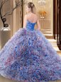 Amazing Multi-color Fabric With Rolling Flowers Lace Up Sweetheart Sleeveless With Train Quinceanera Dress Brush Train Embroidery and Ruffles