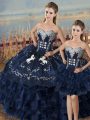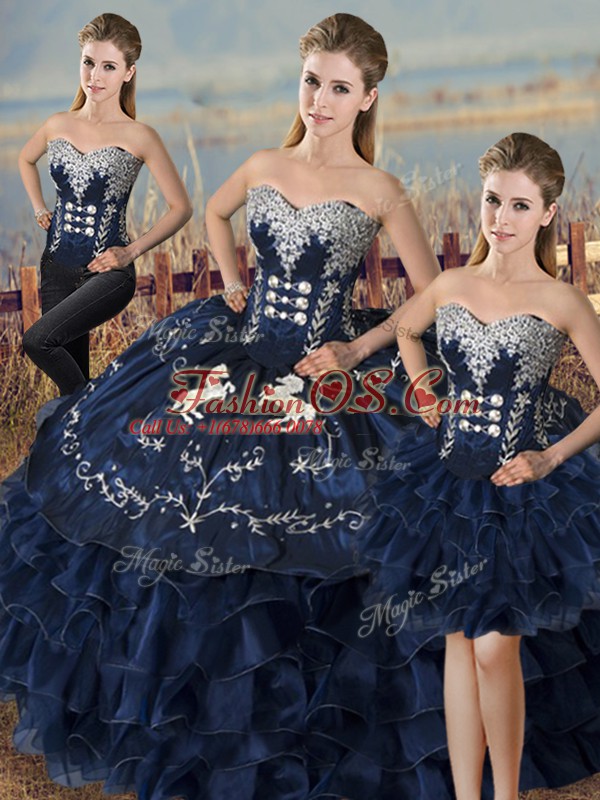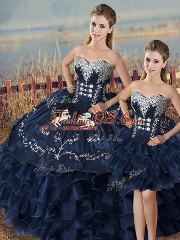 Amazing Navy Blue Ball Gowns Embroidery and Ruffles Sweet 16 Dresses Lace Up Satin and Organza Sleeveless High Low