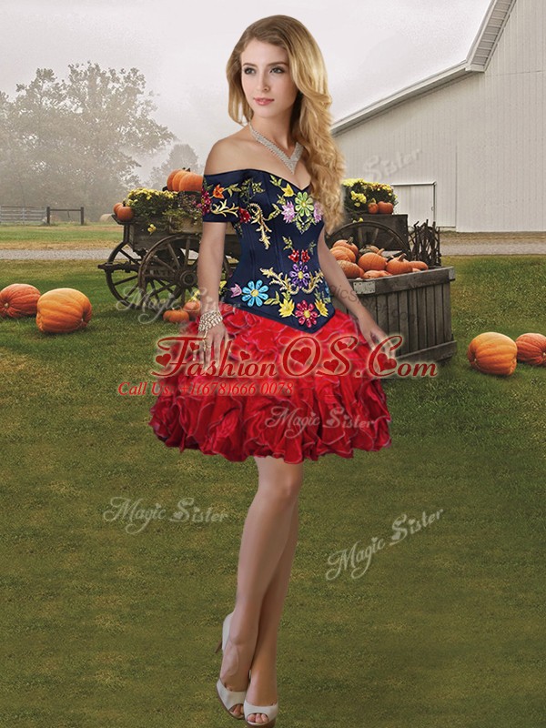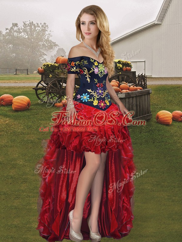 Amazing Red And Black Sleeveless Floor Length Embroidery and Ruffles Lace Up Ball Gown Prom Dress