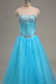 Amazing Sleeveless Tulle Floor Length Lace Up Prom Gown in Aqua Blue with Beading