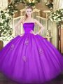 Amazing Strapless Sleeveless Quinceanera Dresses Floor Length Appliques Eggplant Purple Tulle