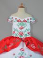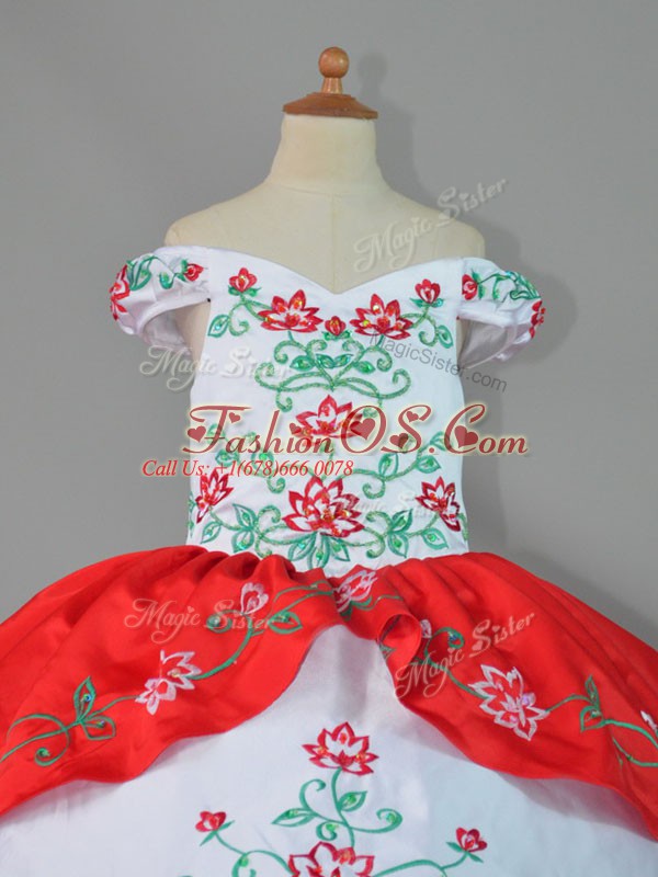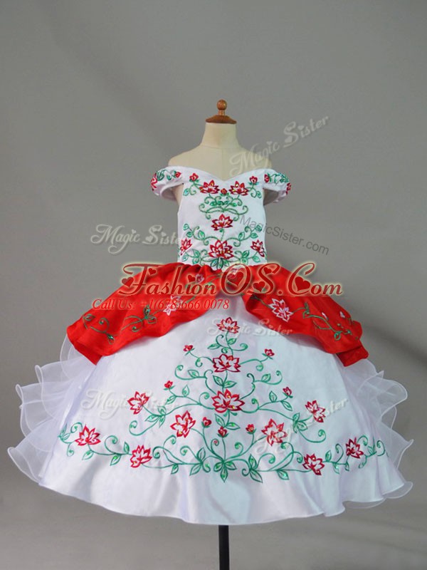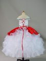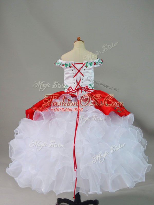 Home >  Special Occasion Dresses >  Lovely Little Girl Pageant Dresses > Amazing White And Red Satin and Organza Lace Up Little Girls Pageant Dress Sleeveless Floor Length Embroidery and Ruffles
