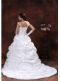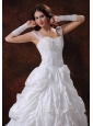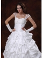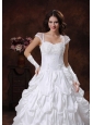 This one will put you to mind of a traditional southern belle, when you put on this white wedding dress! It is highlighted with a applique decorated sweetheart neckline bodice and cap sleeves wraping the shoulder with see-through organza. The A-line skirt with many layers of ruffles has a court train that cascades to the floor. A lace up style closure in the back is popular and secures the dress in place.