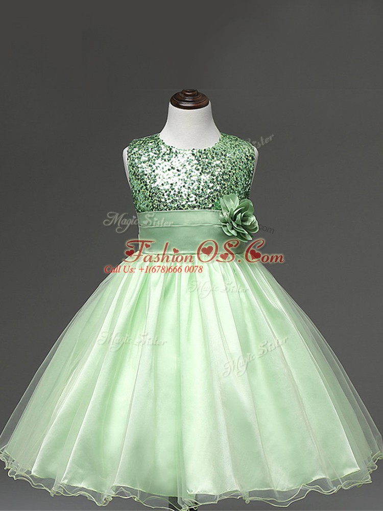 Apple Green Girls Pageant Dresses Wedding Party with Sequins and Hand Made Flower Scoop Sleeveless Zipper