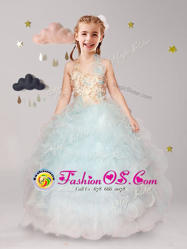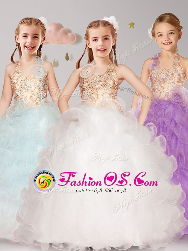 Home >  Special Occasion Dresses >  Cheap Flower Girl Dresses > Apple Green Lace Up Halter Top Beading and Ruffles and Hand Made Flower Flower Girl Dresses Organza Sleeveless