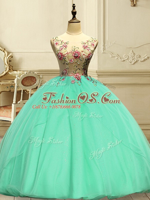 Apple Green Lace Up Scoop Appliques Ball Gown Prom Dress Organza Sleeveless