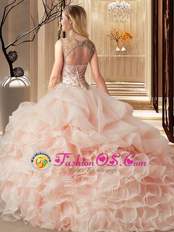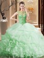 Apple Green Organza Lace Up Scoop Sleeveless Sweet 16 Dress Brush Train Beading and Ruffles and Pick Ups