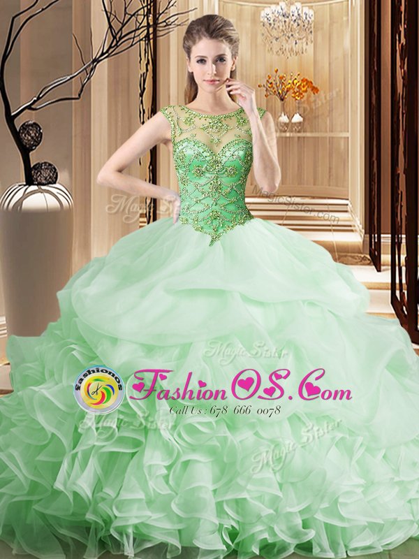 Home >  Quinceanera Dresses >  Cheap Quinceanera Dresses > Apple Green Organza Lace Up Scoop Sleeveless Sweet 16 Dress Brush Train Beading and Ruffles and Pick Ups