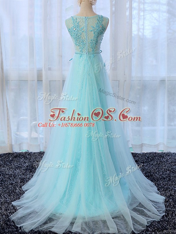 Apple Green Scoop Zipper Lace and Bowknot Quinceanera Court of Honor Dress Brush Train Sleeveless