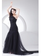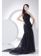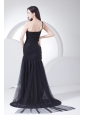 Appliques and Ruching Decorate Bodice One Shoulder  Black Tulle and Taffeta Prom Dress For 2013 Brush Train