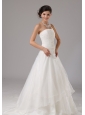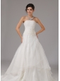 Go for glamour and a fabulous flattering fit with this ball gown wedding dress. A fitted pleated strapless bodice decorated with nice appliques.The elegant A-line skirt starts from the drop waistline with layers of soft fabric highlights the flowy bottom and the romantic train on the back will turn heads. The lace up back finishes the amazing look! An absolutely perfect wedding gown when looking your best is a must.