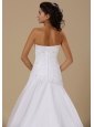 This gorgeous wedding dress features strapless neckline overlayed with tulle, the ruched bodice has an elegent lace closure accented with some embroidery on the bodice. The skirt is made from several tiers of tulle and falls to the floor with a classical chapel train.