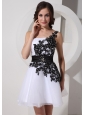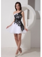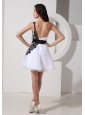 This short white dress for prom features one shoulder and empire waist on the strapless bodice. The black appliques feature the one shoulder. A simple hemline on the short layered skirt completes the look. The hidden zipper in the back of the dress secures it in place and makes for easy off and on. So versatile and so pretty–use it as a base to create a look all your own!
