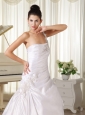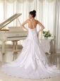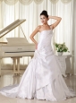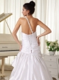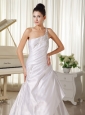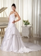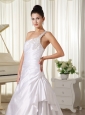 Do you want to show your magic figure fully? This elegant fan-shaped trailing wedding dress is your best choice. This design is the most popular one among all the trailing wedding dresses. It represents the fashion trend in recent years. The asymmetrical neckline and one shoulder strap to the lace up back adorned with refined applique make you sweet and distinctive. The pleats on the haunch modify the figure better. The A-line skirt has taffeta tiers to adds to its overal fullness. The court train creates a splender and drama. You would be the most beautiful and attractive angel in the wedding ceremony.