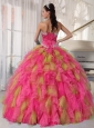 This gorgeous quinceanera ball gown features a fitted, strapless neckline accented with appliques in the bodice.The waist of this ruffled quinceanera dress was wrapped with ruched ribbons around waist which is decorated with a rosette flower.