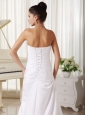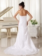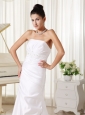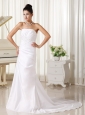 Simply gorgeous this white wedding dress is! The fitted, strapless bodice features a straight neckline and ruched applique decorations throughout. The skirt in stunning fabric hugs hips to the floor to create a beautiful sweep train. A lace up back completes this fabulous design. The simple one can leave a longer impression in contrast, and this one is a perfect example!