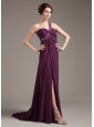 You'll absolutely love this flirty strapless ball gown for prom, cocktail or special occasion party. This burgundy prom dress features a ruched bodice and one strap encrusted with appliques and beadings. A seductive high slit lets you glide across the dance floor with ease. The floor length chiffon skirt flows beautifully with a loose fit that will make it easy to dance the night away.