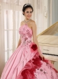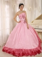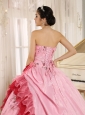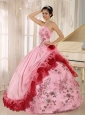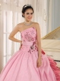A romantic baby pink quinceanera gown features a asymmetrical neckline and a fitted bodice with floral apploques thoughout sharply show your girly beauty. The waistband with little lovely flower on the dress add the fine look and shinning effect.The skirt accent a split taffeta overlay hemmed with organza add the sassy and lovely dress, and the underskirt is embellished with exquisite floral appliques. A lace up corset style closure in the back secures the dress in place. Dressing this dress makes you feel like a princess.
