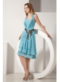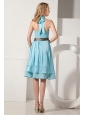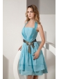 Aqua Blue A-line Halter Knee-length Bridesmaid Dress Taffeta Ruch and Bow