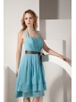 This short halter prom dress has a chic and youthful style and is sure to become a favorite in your closet.This short gown perfect for prom,or homecoming featuring a simple halter neckline and a shirred black sash at the empire waist that ties in the back.The dress sways beautifully across the floor when you move,as if you are floating on air.