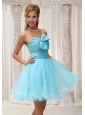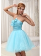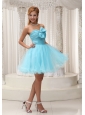 Home >  Prom Dresses >  Modest Prom Dresses > Aqua Blue A-line Prom Dress For 2013 Taffeta and Organza Ruched Bodice Mini-length