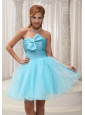 Make the most of your gorgeous legs with this aqua blue utterly ethereal cocktail strapless babydoll dress! Its pretty sweetheart bodice is accented with a lovely bowknot. A hidden zipper makes for easy off and on and secures the dress in place. Ethereal material floats around the skirt, adding extra enchantment and allure.