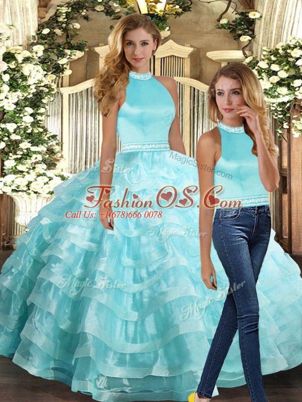 Aqua Blue Ball Gowns Beading and Ruffled Layers 15th Birthday Dress Backless Organza Sleeveless Floor Length