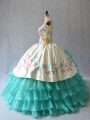 Aqua Blue Ball Gowns Embroidery and Ruffled Layers Quinceanera Dresses Lace Up Satin and Organza Sleeveless Floor Length